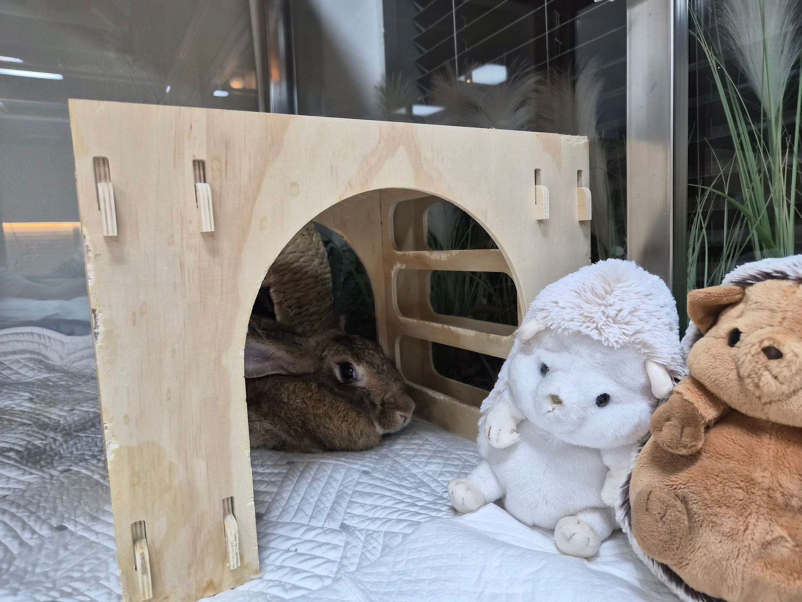 돌봄 플랜 | - 익일 레이동물병원 내원 예약하기 - 현재 산소방 (80 x 180 cm)에서 임시로 지내면서 천천히 주변 환경에 익숙해 지고 쓰담과 간식 등을 통해 돌봄자와 신뢰를 쌓는 기간을 갖을 수 있도록 노력하기. - 그동안 주로 사료를 먹었던 것으로 추정되어 벼과 건초로 식이 전환 할 수 있도록 다양한 벼과 건초와 간식 건초를 제공하고 선호도 파악하기 - 자연스럽게 은지가 원하는 화장실 구역을 지정할 수 있도록 배려하기 |